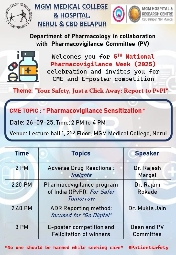 Pharmacovigilance Sensitization CME program was held on 14th December 2024 at 12 noon in Lecture Hall 1, MGM Medical College, Nerul, Navi Mumbai. Inauguration Pharmacovigilance Sensitization CME was held on 14th Dec 2024